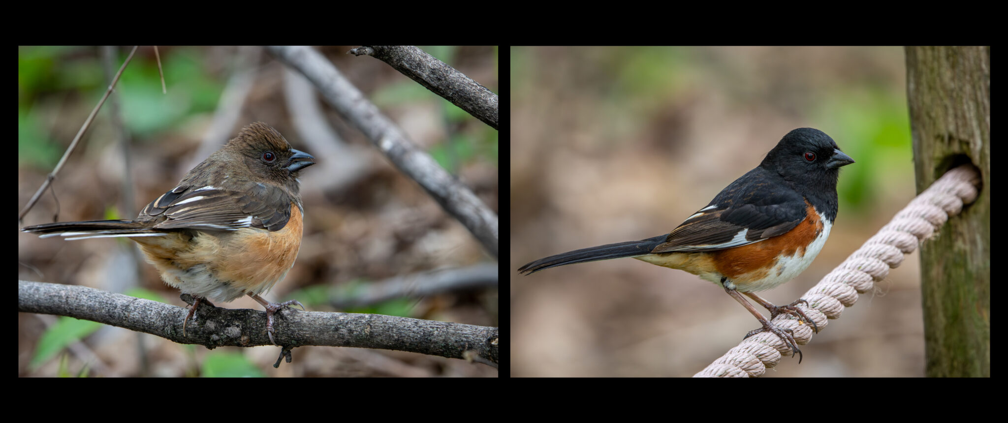 While birding in Downtown Chicago’s Montrose Point we came across a number of Eastern Towhees. Most of the time we saw them they were digging for grubs in the dead leaves on the ground. These two hopped up for a better look before resuming their feeding.