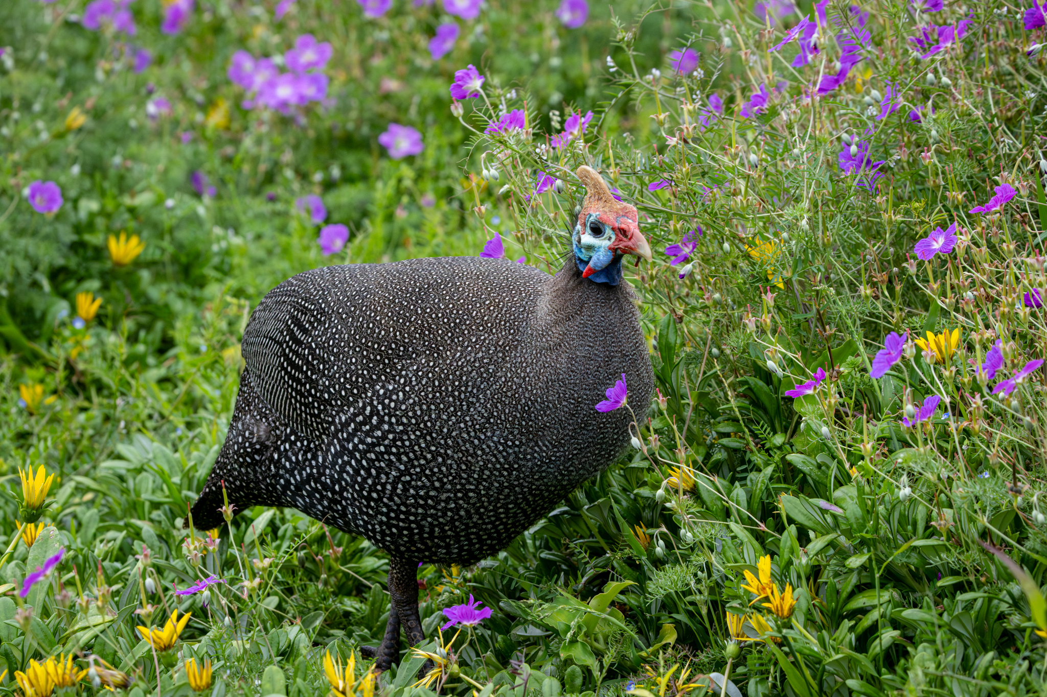 We did have more ground to cover that day so we reluctantly withdrew from the gardens, but on the way out I spotted this Helmeted Guinafowl foraging in the flower bed. Although these were common birds seen in flocks in the fields as we drove about South Africa, this is the best look I had of one. A face only a mother could love…