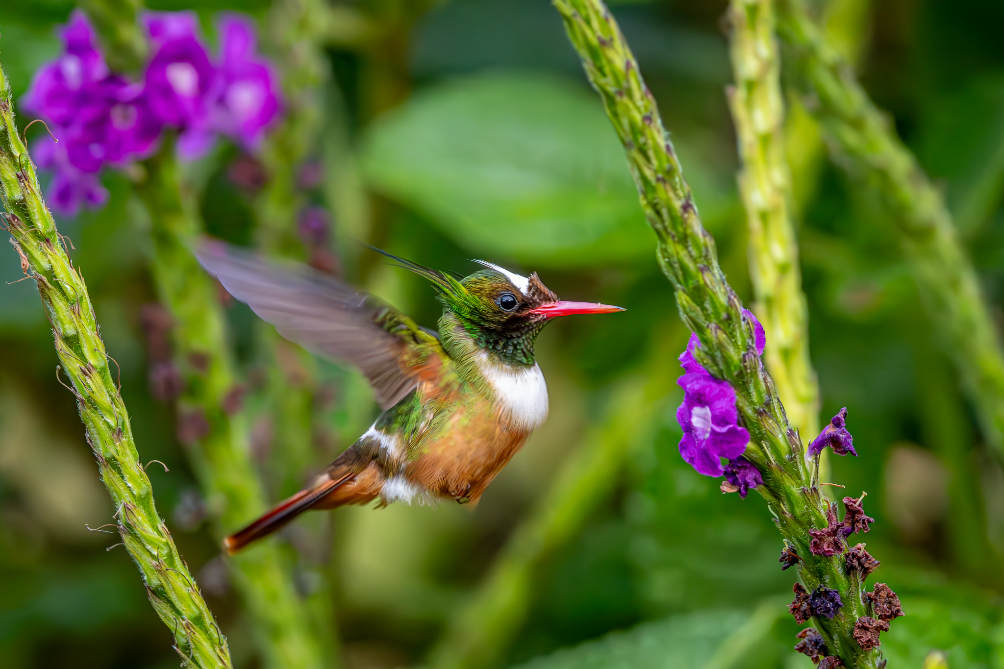 I entered this shot in our $5 Shot contest with my fellow Birding Buddies. It is of a White-crested Coquette we saw in Costa Rica. One of the judges marked it down because of the light-green leaf above the head of the bird was distracting.