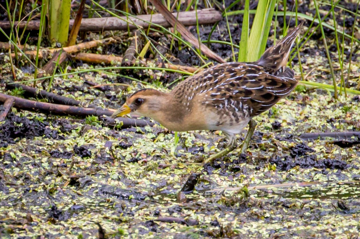The Sora’s large feet allow it to “walk on water” that is covered in algae.