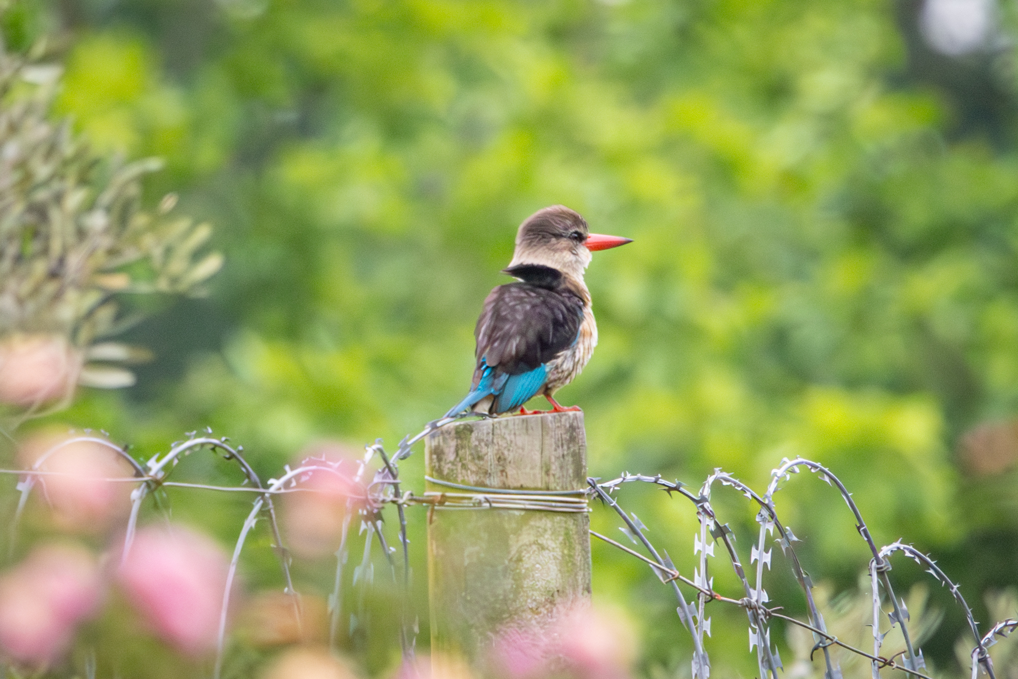 One of the more colorful birds seen behind the Guesthouse was a Brown-hooded Kingfisher. Here’s a distant shot of it showing its bright-red beak and feet.