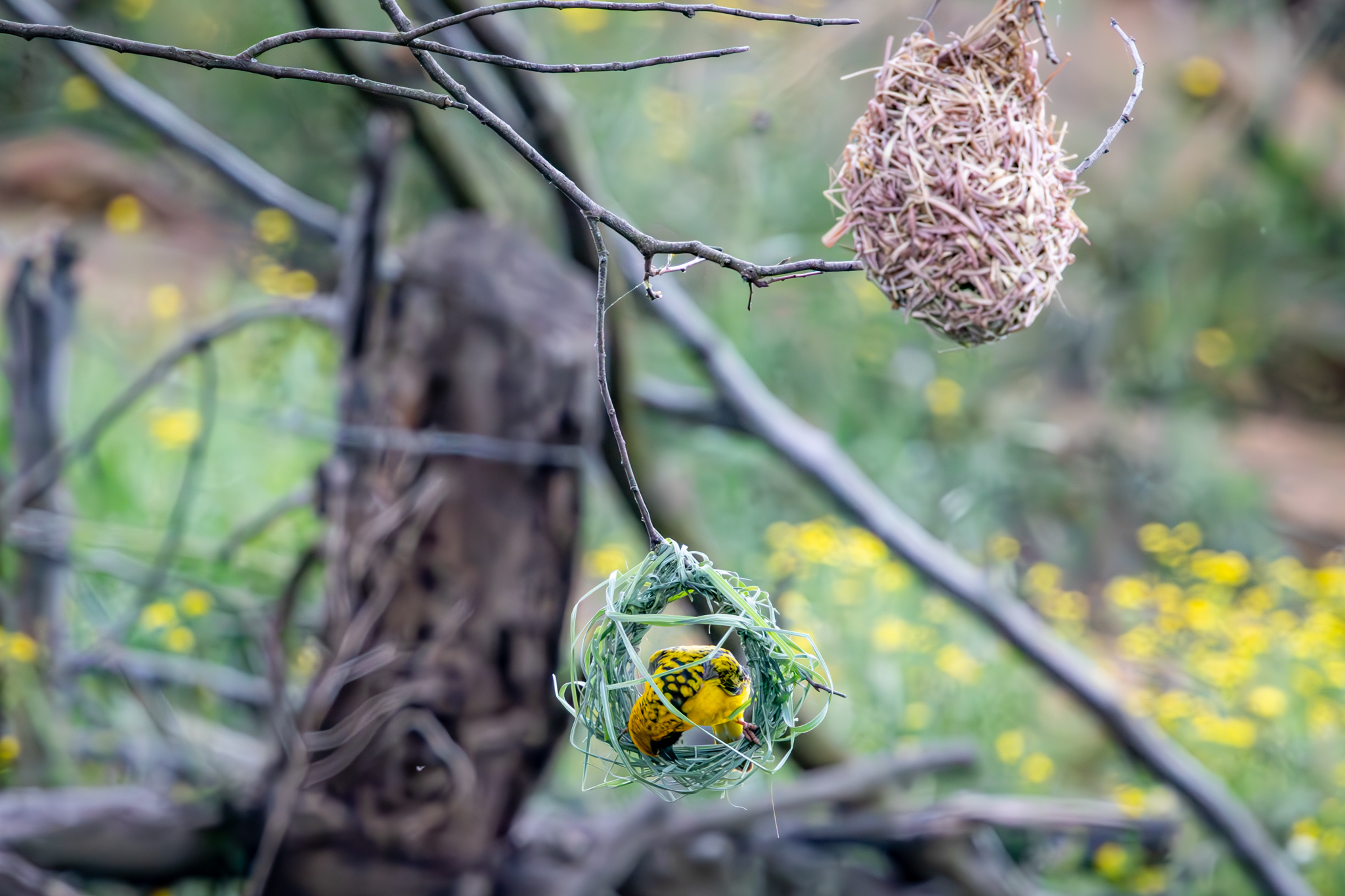 The Village Weaver continues its work on a new nest, with the old nest close by.