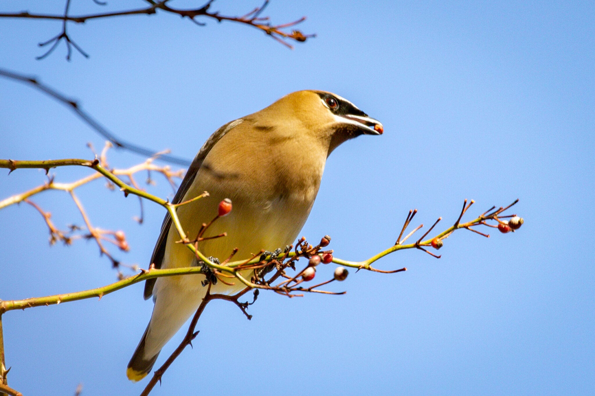 This Cedar Waxwing is proud it could reach over and grab a berry. The next one might be tougher.