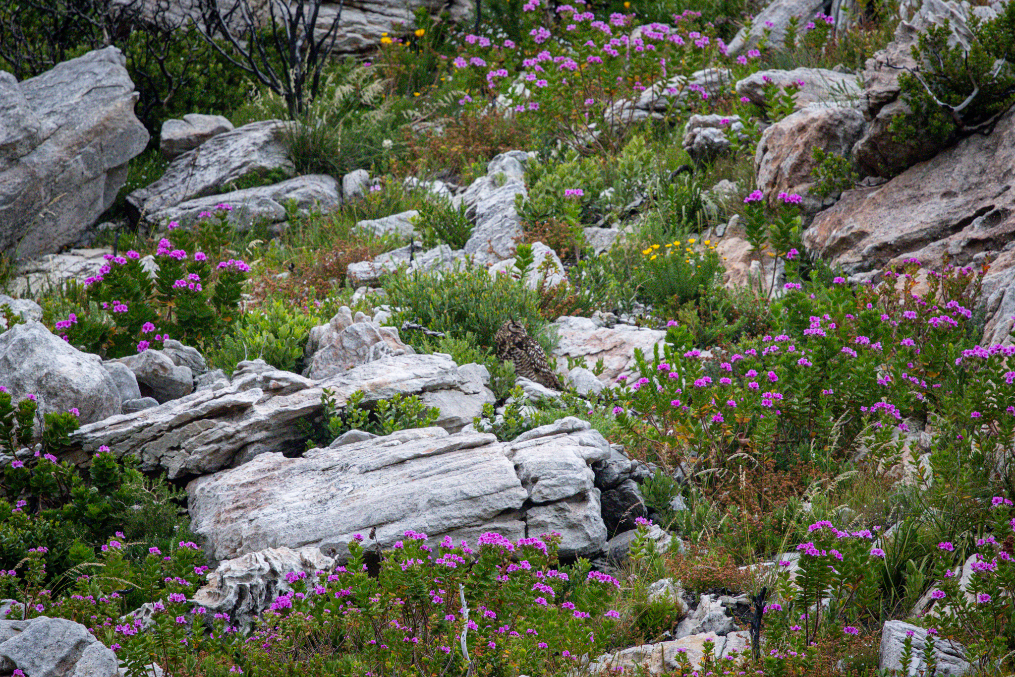 Hiking up a trail our guide heard the Cape Eagle-Owl we were search for. By slowly scanning the area above us with my binoculars I was able to spot the Cape Eagle-Owl and I cried out, “I got it”! Everyone wanted to know where, but I was afraid to lower my binoculars for fear of never finding it again (you couldn’t see it with the naked eye). I slowly scanned the area directly around the Eagle-Owl until I felt confident enough to describe what to look for so others could find it, too. See the next photo for a better look.