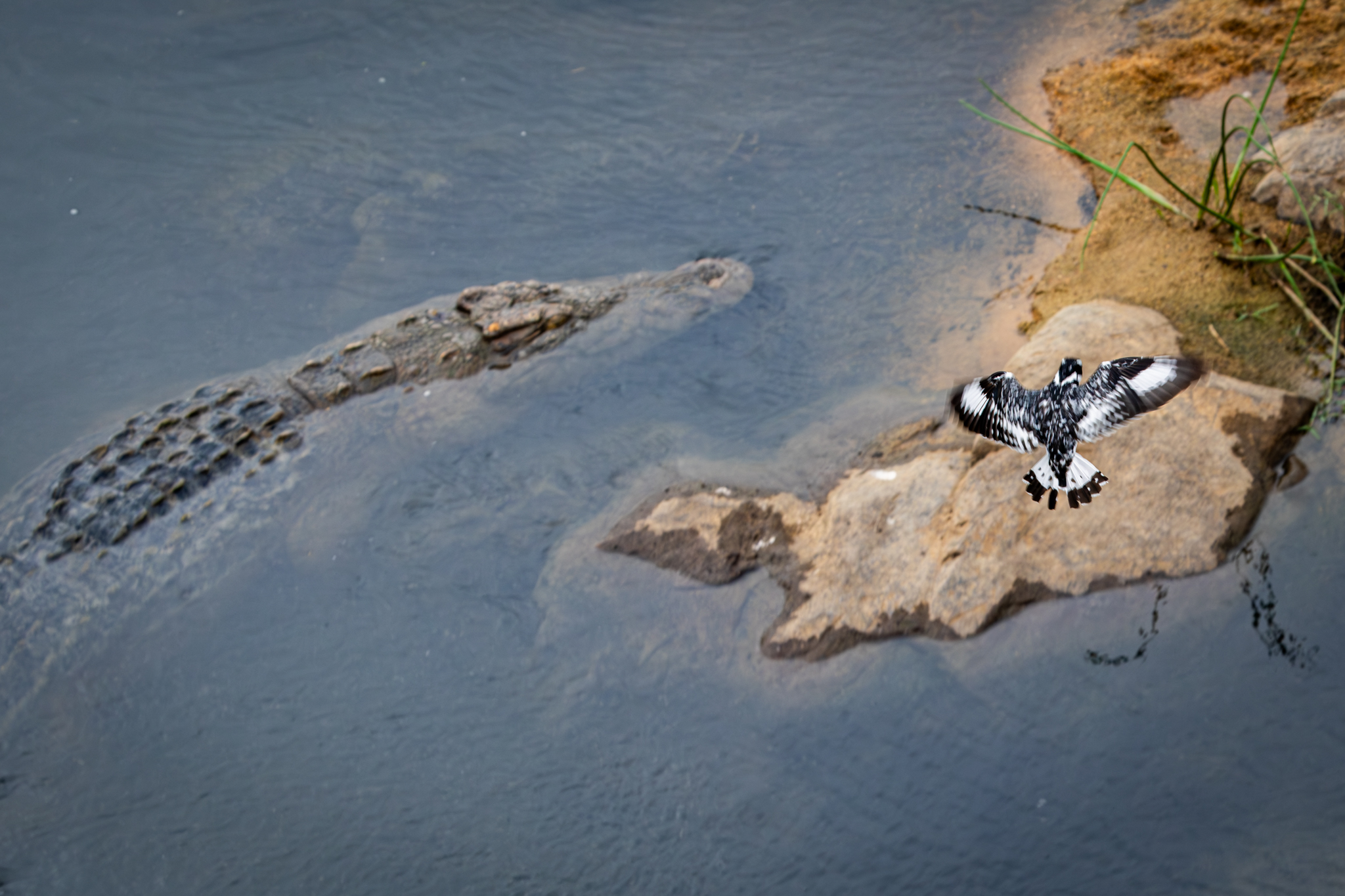 Not a great shot of the Pied Kingfisher as it hovers in its search for food but I like the view with the crocodile in it.