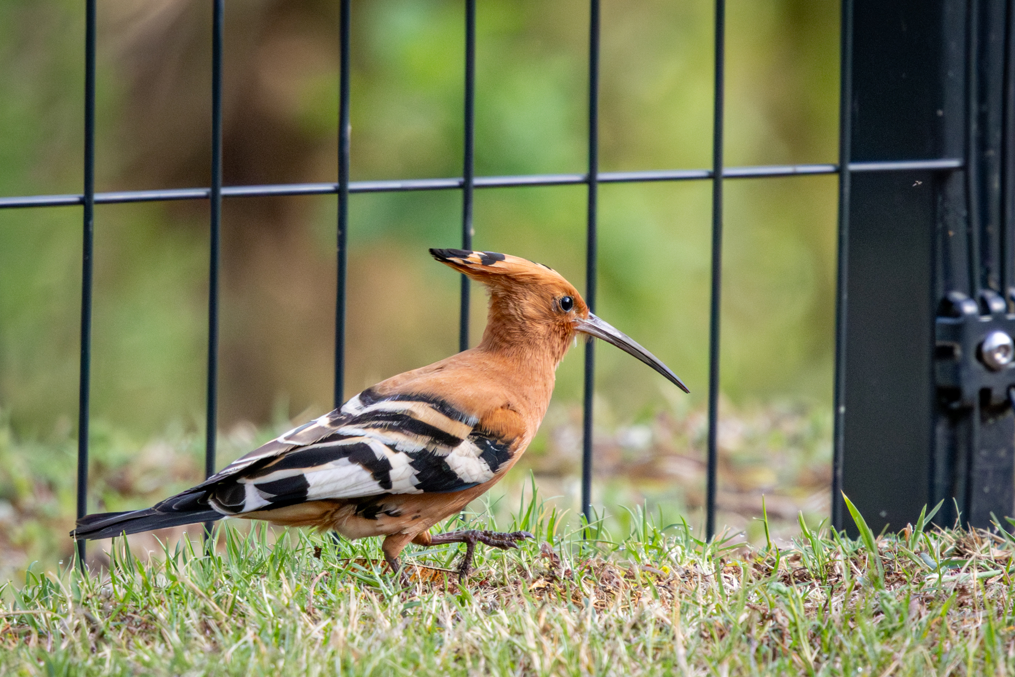 A Common Hoopoe walks along the fence-line at the back of the property.