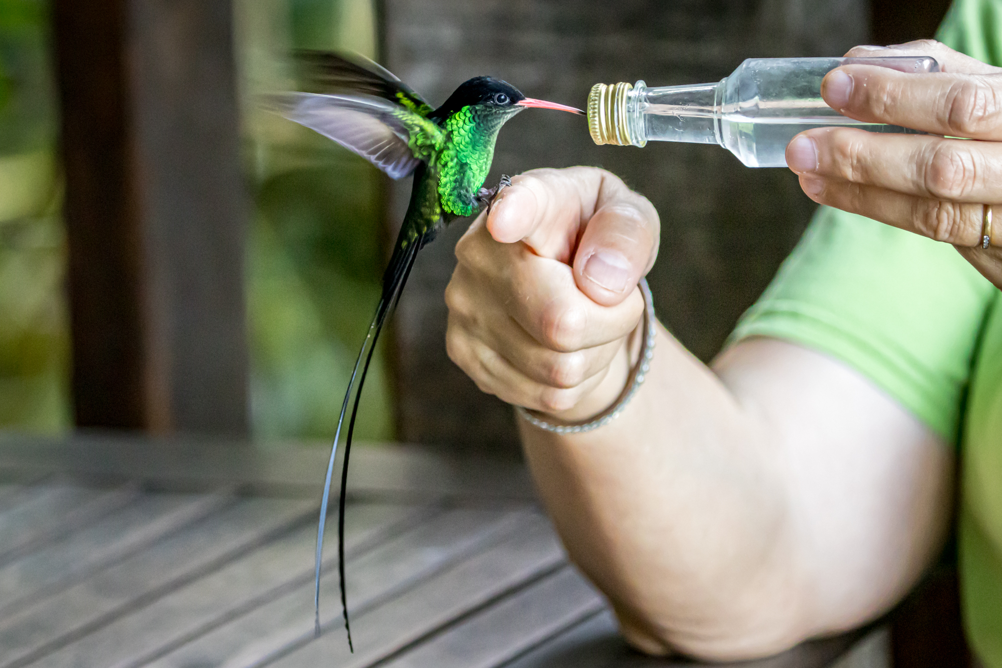 The caretaker for the Sanctuary passed out airline liquor bottles filled with sugar-water and a small hole punched through the cap. He demonstrated how to hold the bottle in one hand and to position your index finger of your other hand about 5″ away. Soon enough a hummingbird came to feed and if you were lucky enough one would perch on your finger while feeding. Here you get the full view of this beautiful bird.
