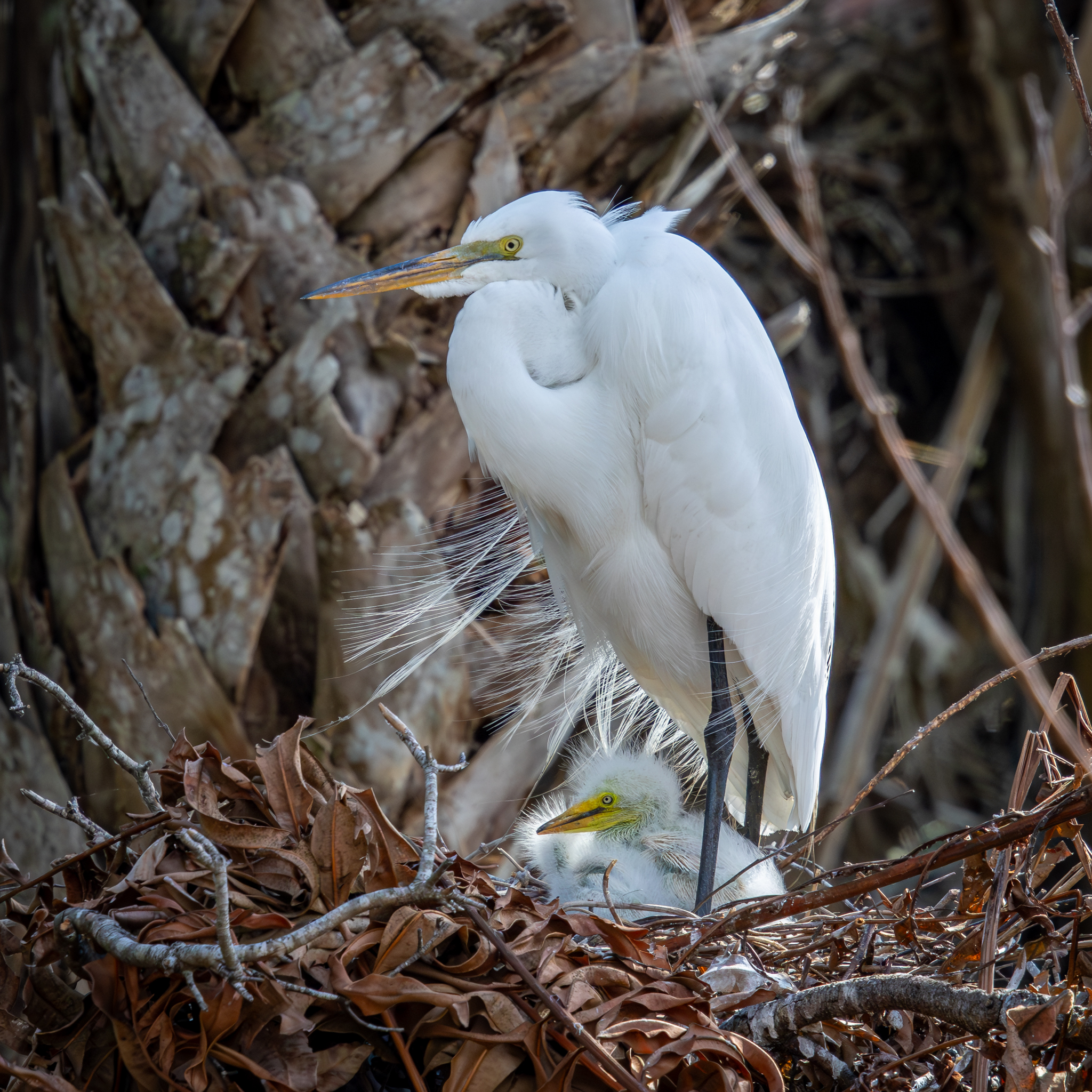 This shot of a Great Egret and chick was taken at the Orlando Wetlands in an area that had many Great Egret and Roseate Spoonbill nests – all with young chicks.