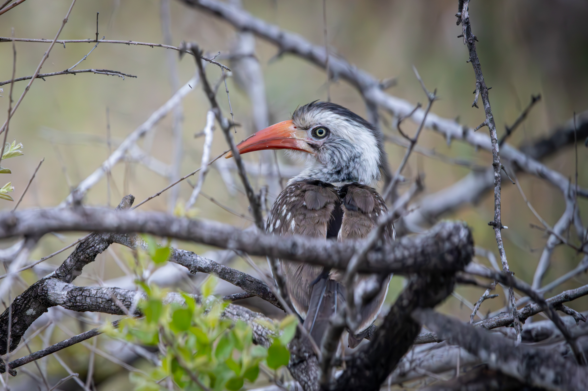 This Southern Red-Billed Hornbill was buried in a tangle of dead branches.