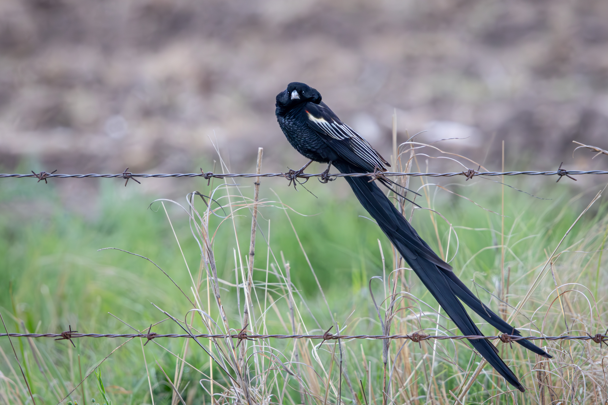 You get a better idea of the length of the Long-tailed Widowbird’s tail when it was perched on this barbed-wire fence.