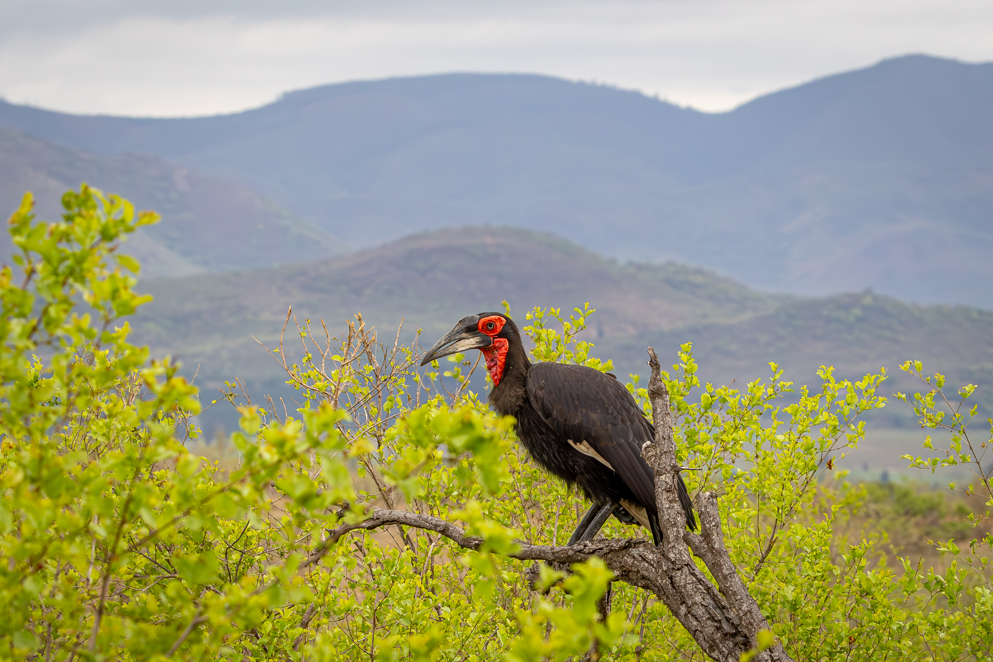 This male Southern Ground Hornbill was perched in a dead snag high enough I could capture the hills in the background.