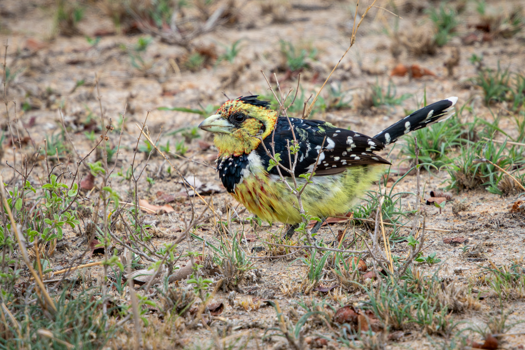 Recalling that we were not allowed to step out of our safari vehicle in Kruger we still were able to observe many birds along the roadways. Here is a Crested Barbet foraging for food on the ground.