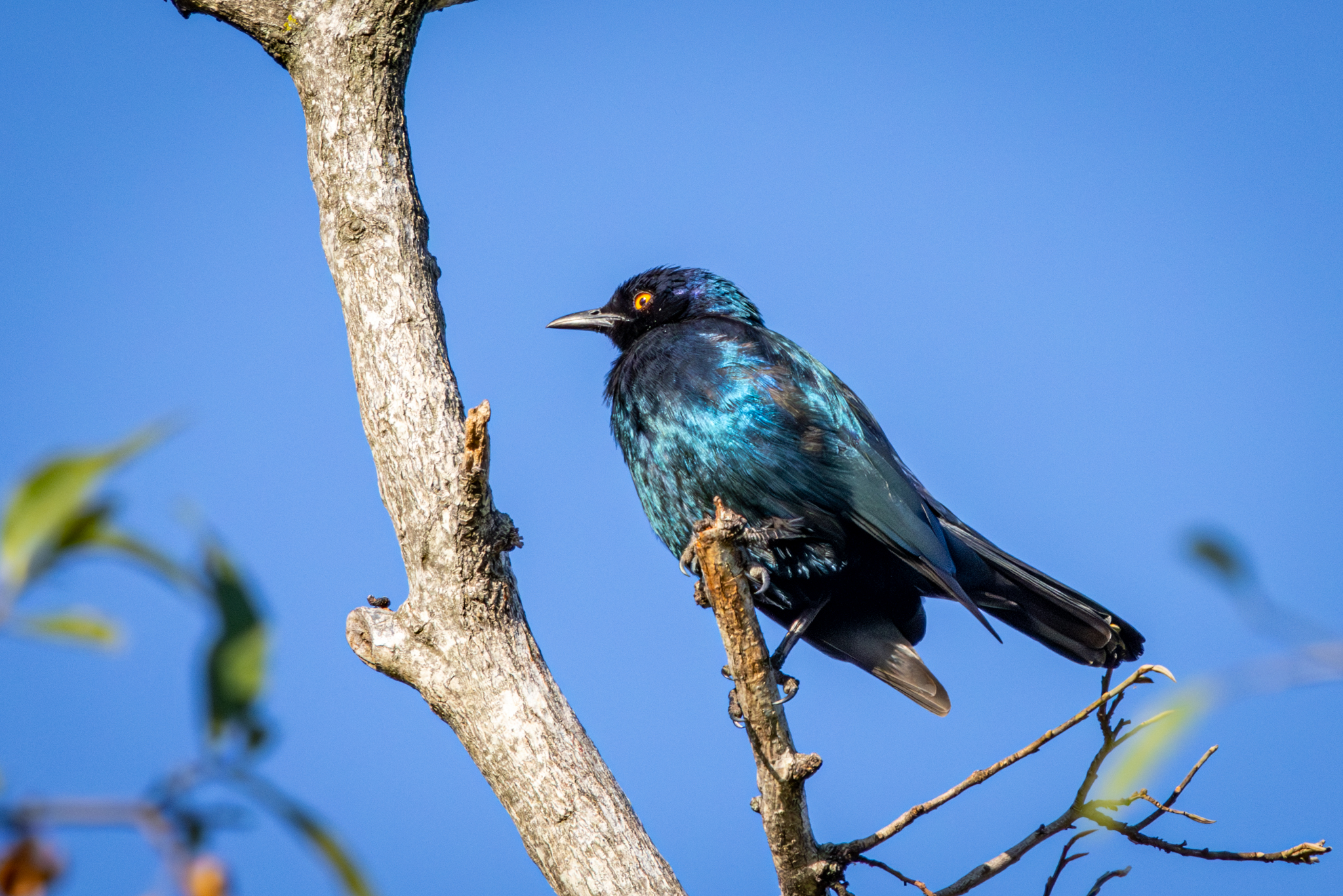 We encountered many new species of Starlings while in South Africa and Kruger in particular. Here’s a look up at a Cape Starling, also with an iridescent body, but blue.
