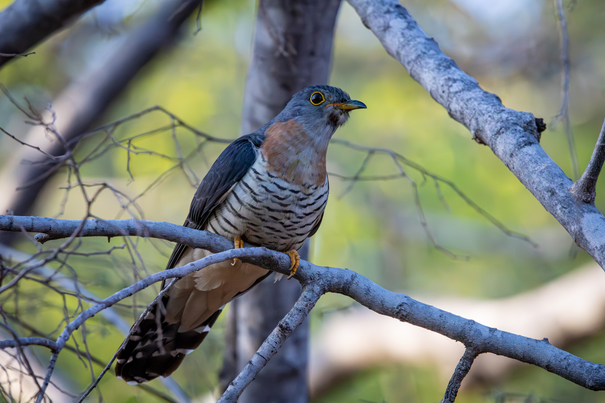 Our Red Hill Birding guide Josh would lead us on a walk before breakfast each morning. This morning we got out to walk the grounds of our lodging at Berg-en-Dal at about 6 AM. Looking in a tree above our cute little cottage we saw a Red-chested Cuckoo. Get a look at those eye-rings!