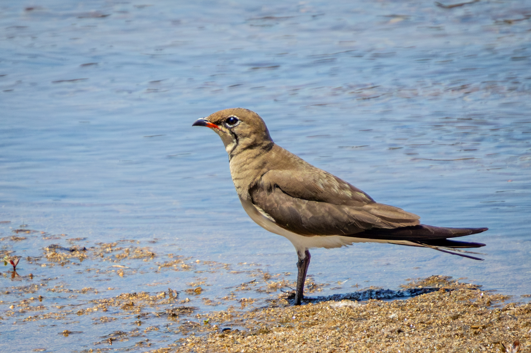 Along the shore, a Collared Pratincole gets ready to take off. Note the black line on the face that outlines its neck. When flying it has a forked tail.