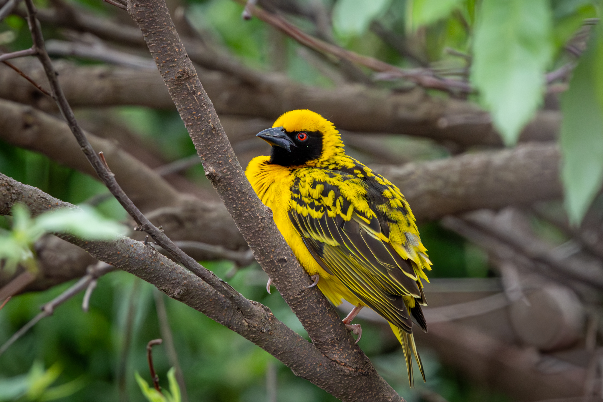 Beautiful bird and image! The red eye contrasting with the black mask and yellow body is stunning. Nest building images also superb.