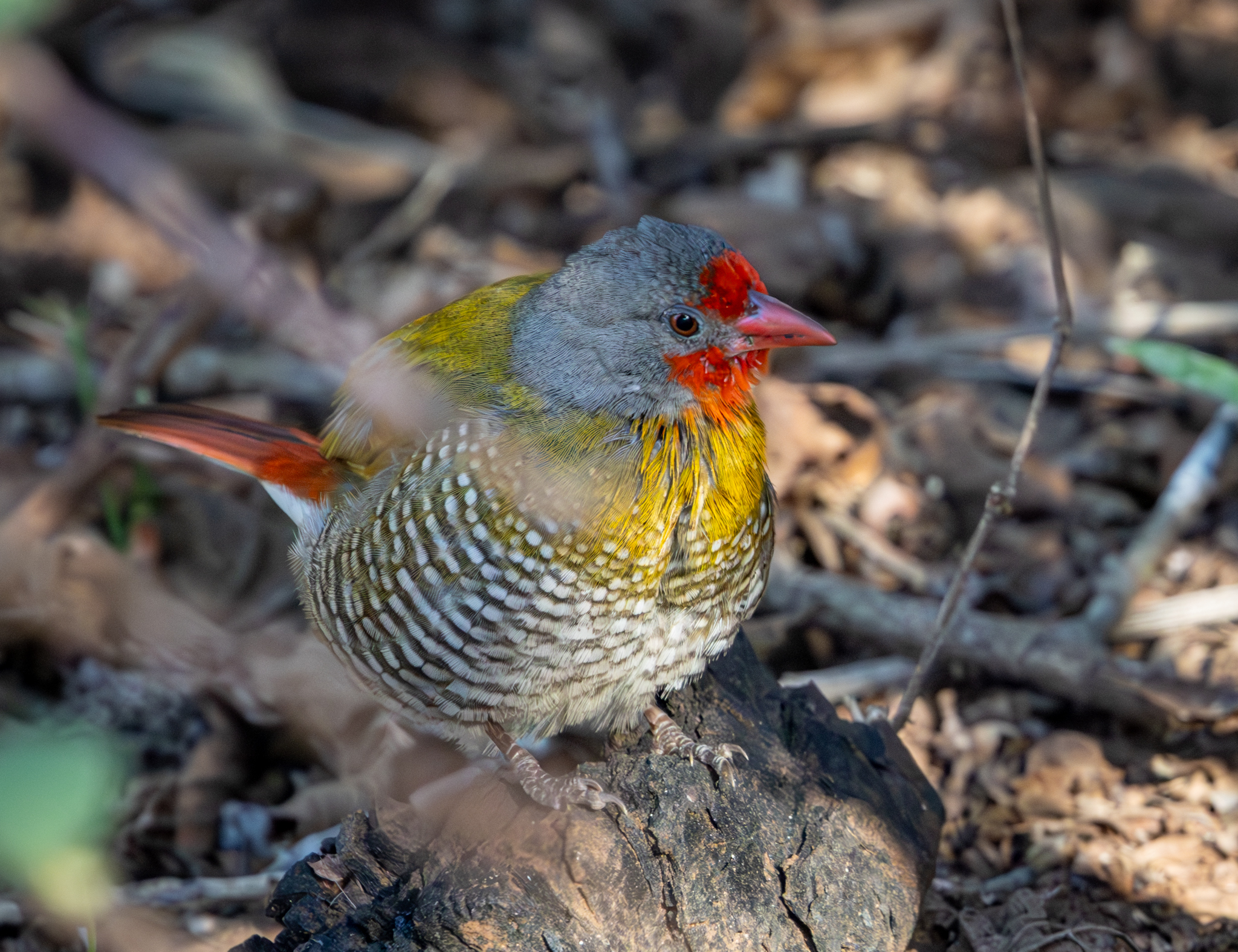 After waking early I went outside our cabin at Lower Sabie Rest Camp and found this Green-winged Pytilia foraging near the porch.