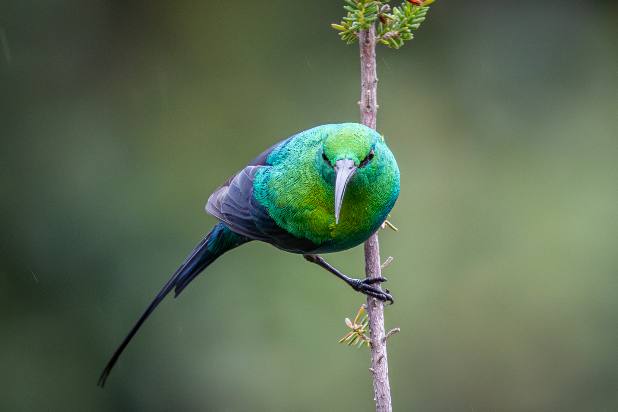 A new species of sunbird spotted at Kirstenbosch Gardens was Malachite Sunbird. I included an image of this one on my 2026 calendar, so here’s a different shot of the same male. Notice the raindrops coming down in the background.