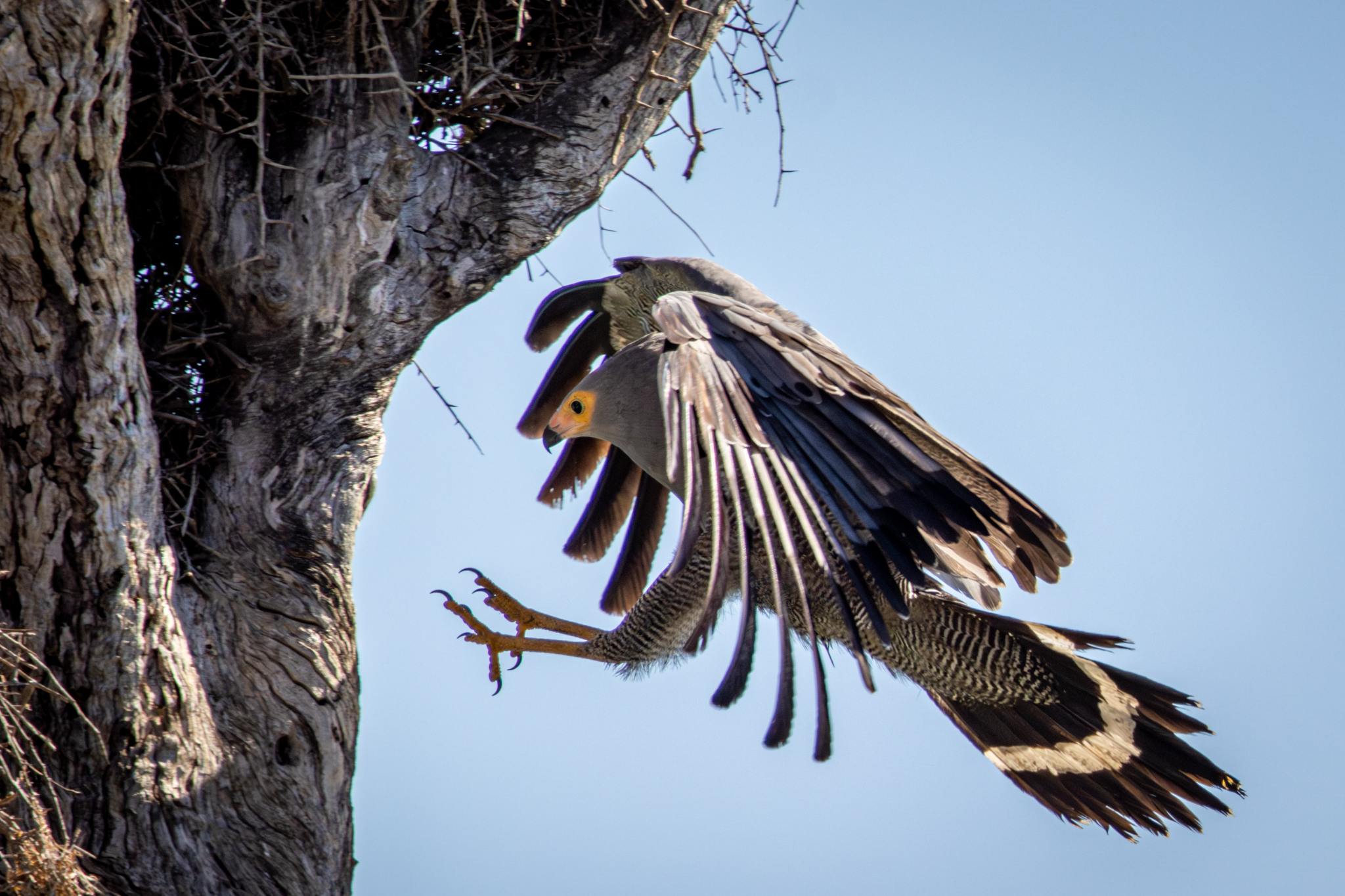 We would pull into the large pond formed by the Sunset Dam each day.  There we saw a variety of shorebirds and hippos keeping cool in the water.  In the middle of the pond was a large, dead tree that was covered by the nests created by a group of Lesser Masked Weavers.  An African Harrier-Hawk knew those weavers were hiding in their nests so it tried to flush them out by landing repeatedly right on the nests.  I never saw one weaver try to sneak out so the Harrier-Hawk got increasingly frustrated.