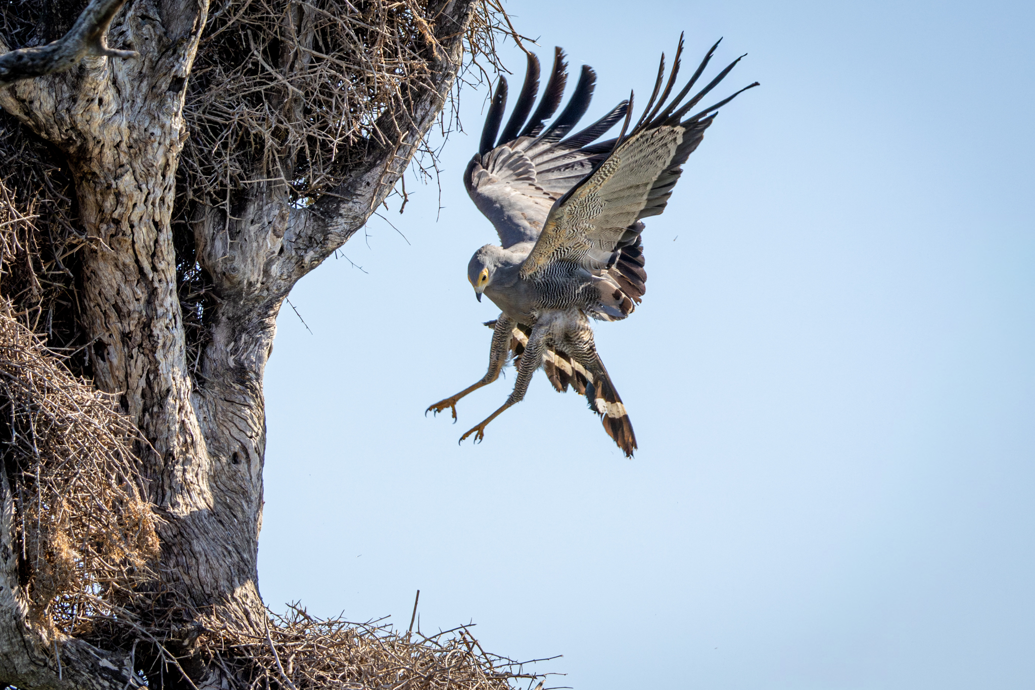 We would pull into the large pond formed by the Sunset Dam each day. There we saw a variety of shorebirds and hippos keeping cool in the water. In the middle of the pond was a large, dead tree that was covered by the nests created by a group of Lesser Masked Weavers. An African Harrier-Hawk knew those weavers were hiding in their nests so it tried to flush them out by landing repeatedly right on the nests. I never saw one weaver try to sneak out so the Harrier-Hawk got increasingly frustrated.