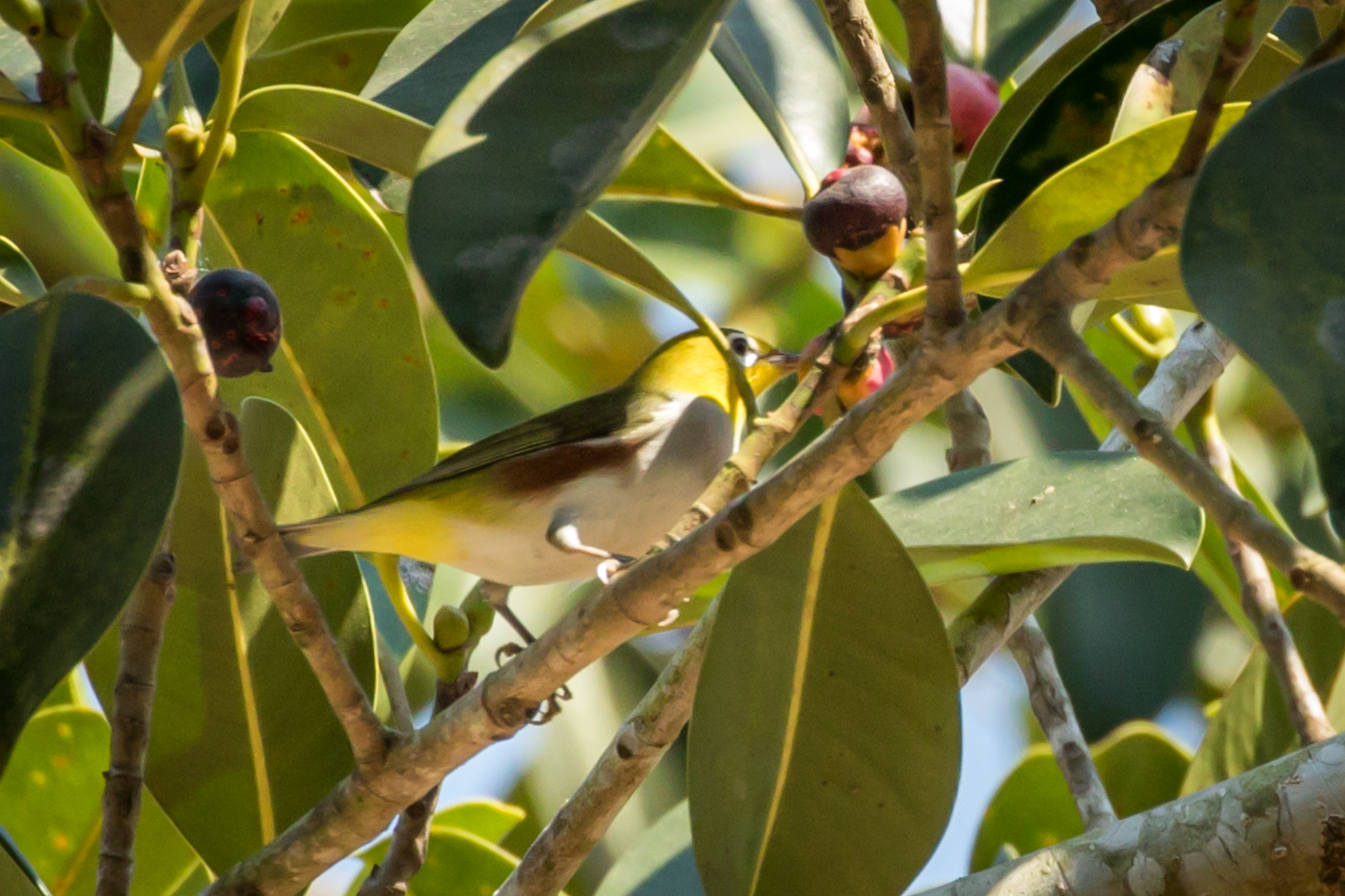 This Chestnut-flanked White-eye has a rich, solid streak of chestnut brown on the flank, indicating it is a male. The streak is much weaker on the female.
