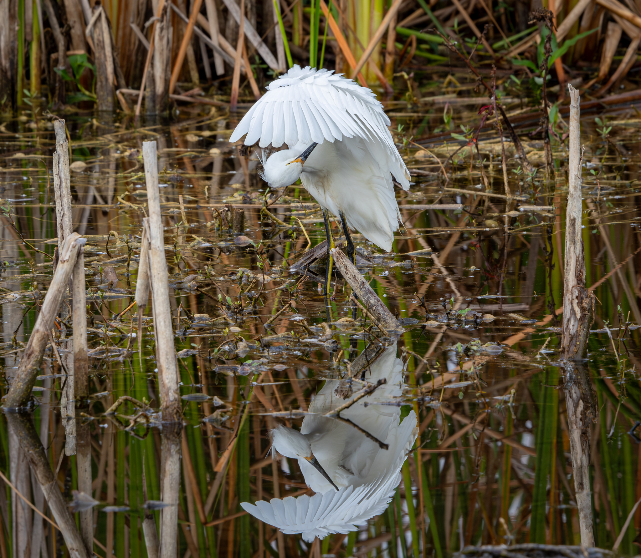 This reflection shot of a Great Egret was taken in Harns Marsh along a canal with still water, making it a clean reflection.