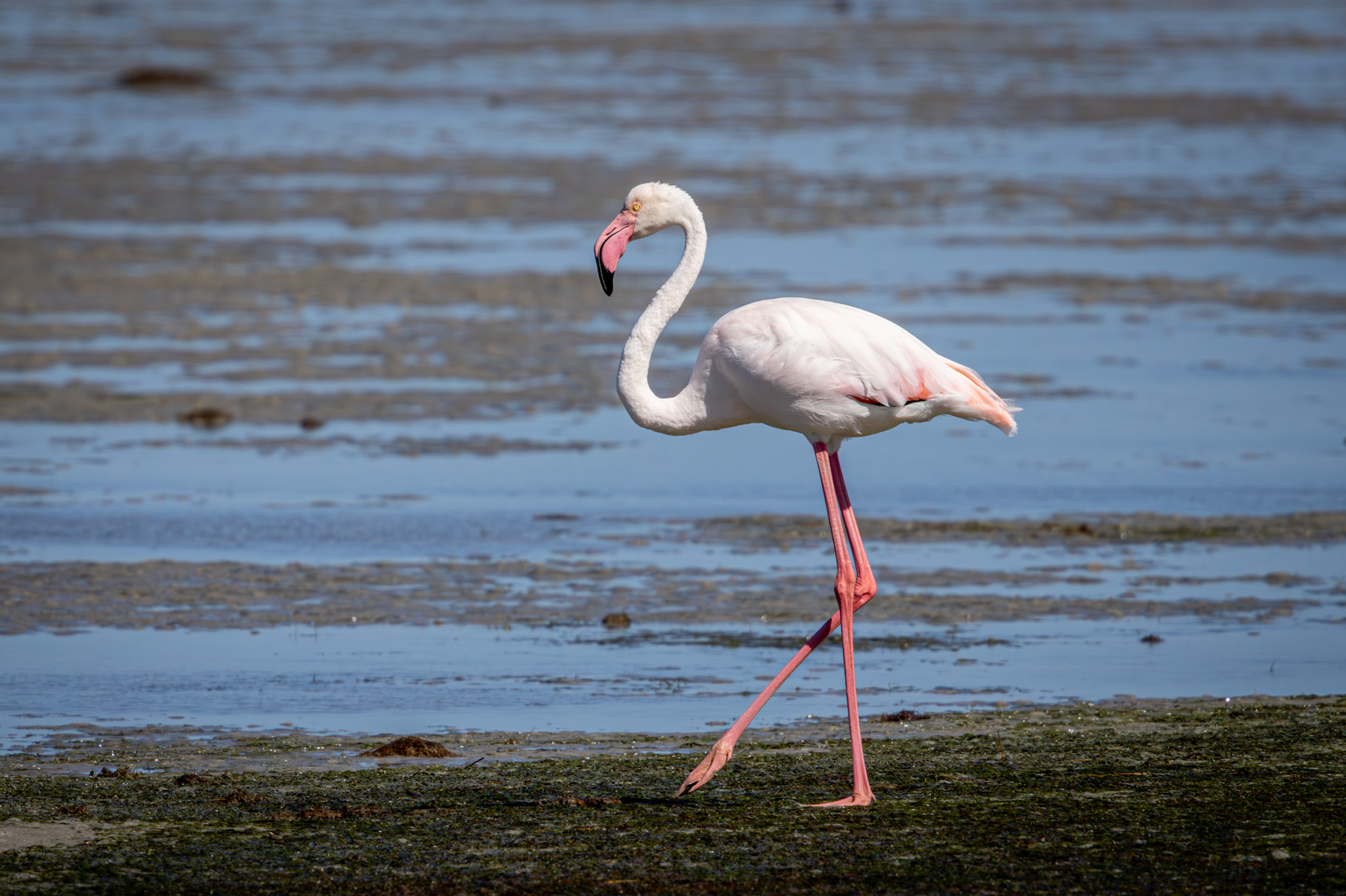 Easy to photograph, this Greater Flamingo foraged its way past the front of the Seeberg Hide (an enclosed wooden structure with a narrow opening facing the marsh designed for bird viewing).
