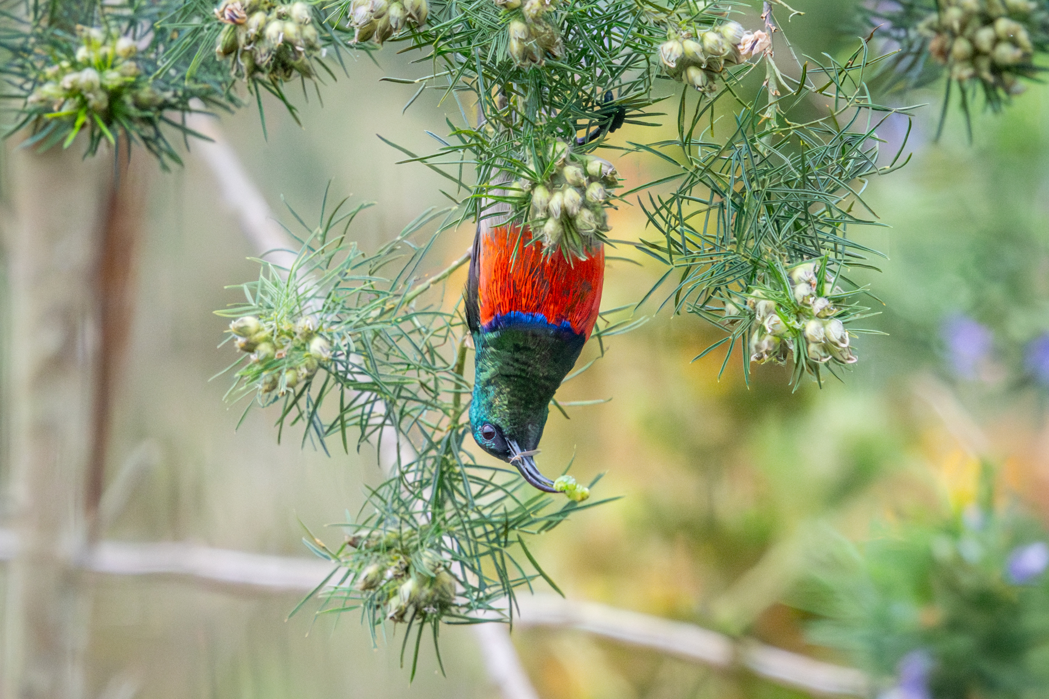 A Double-collared Sunbird hung upside-down to feed on the seeds of one of the trees on the grounds.
