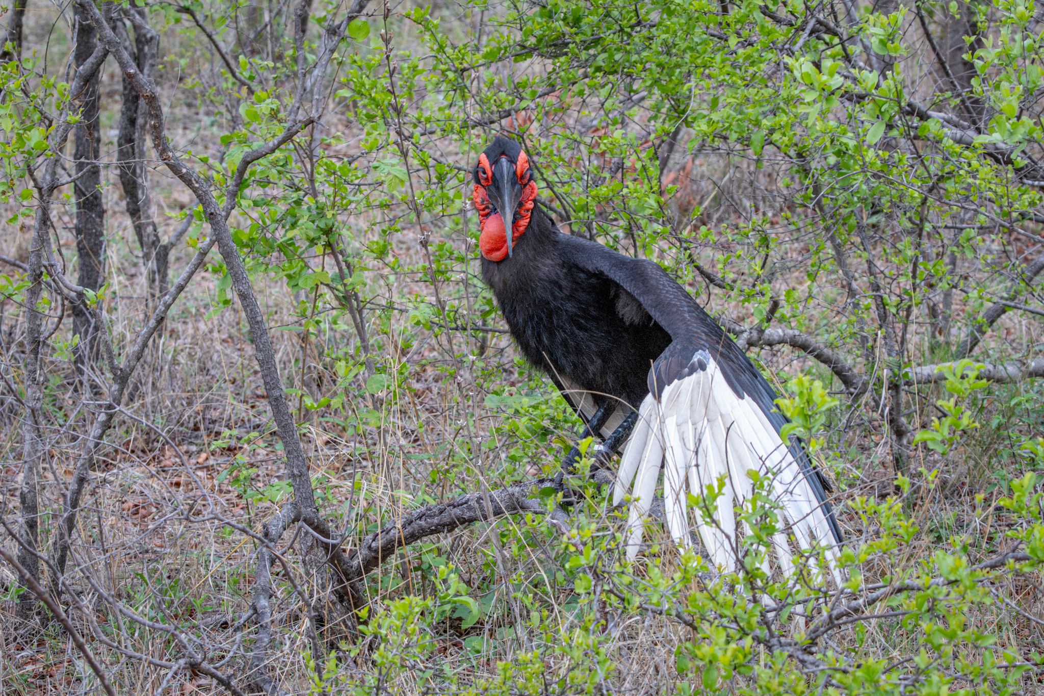 When perched, the male Southern Ground Hornbille is black and white. Here it extends a wing showing the hidden white feathers.
