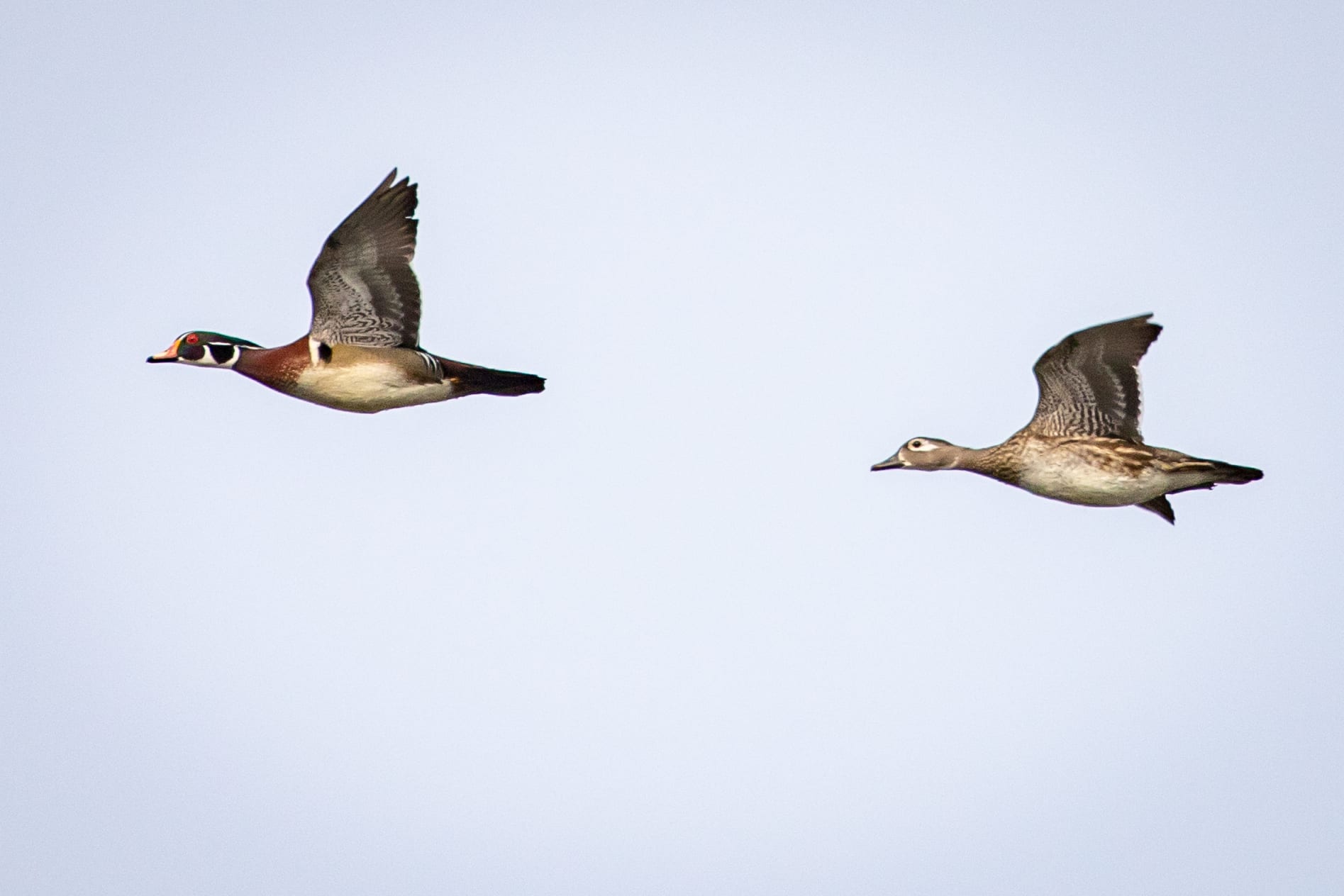 A male (L) and female (R) Wood Duck in the same shot. Impressive (if I do say so myself).