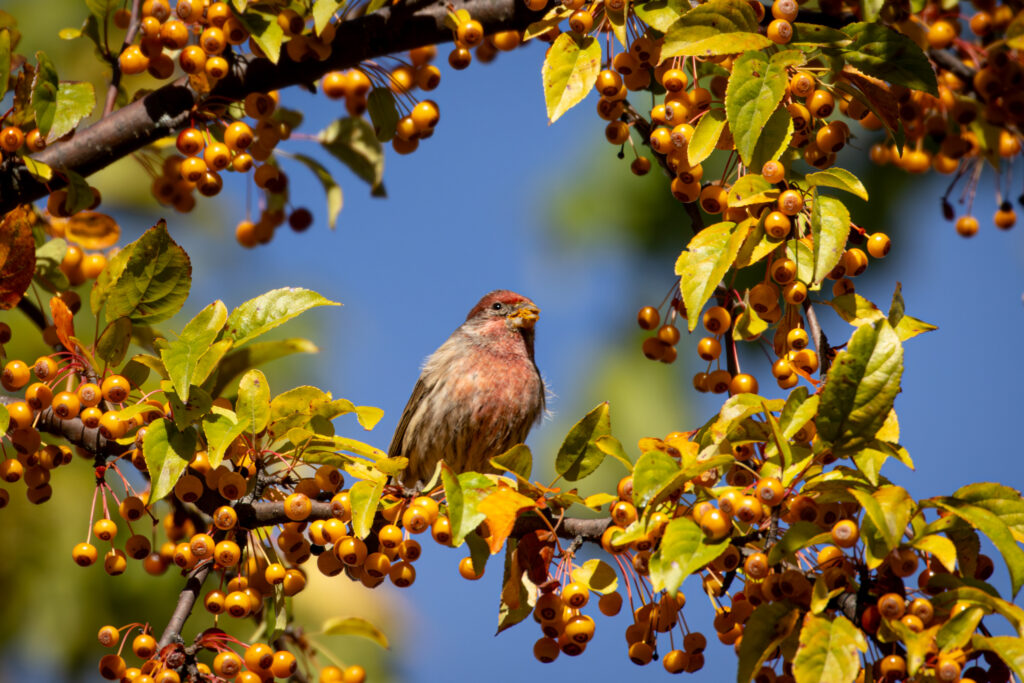 Last week I posted the following two pictures and asked, “Which one is better?” Well it’s unanimous! The first pic with the Tighter Crop was preferred. All said that they liked the Tighter Crop because it focuses the viewer’s eye on the bird. Gurineb said it best: “It focuses on the bird. In the wider crop the second circle of blue is distracting. Part of the job of the artist/photographer is to control the movement of the eye, and you want the eye on the bird. The berries make a lovely frame.”