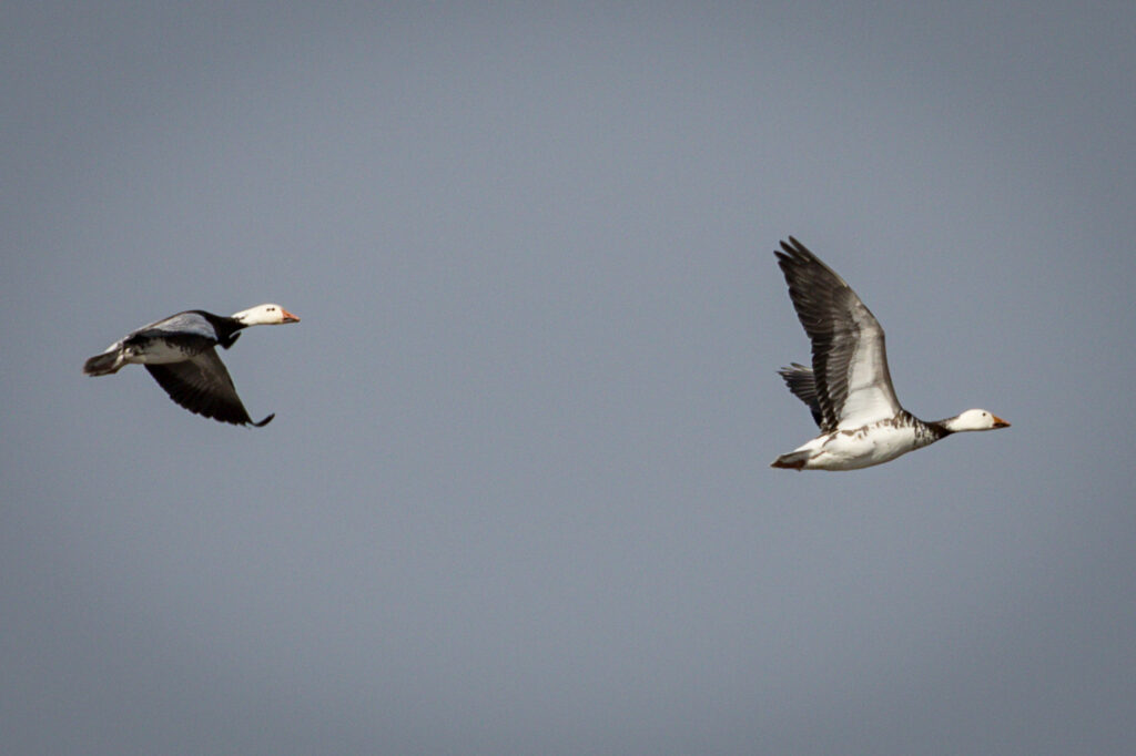 Snow Geese can be found in two color variants, or morphs; the white (or “snow”) and the blue-gray (or “blue”). The white morph is all white except some black on their primaries (wing). Blue morphs are all blue-gray except for white on their head, neck, and tail. Both morphs have a black tomia (cutting edges) along their bills making them appear to be grinning.