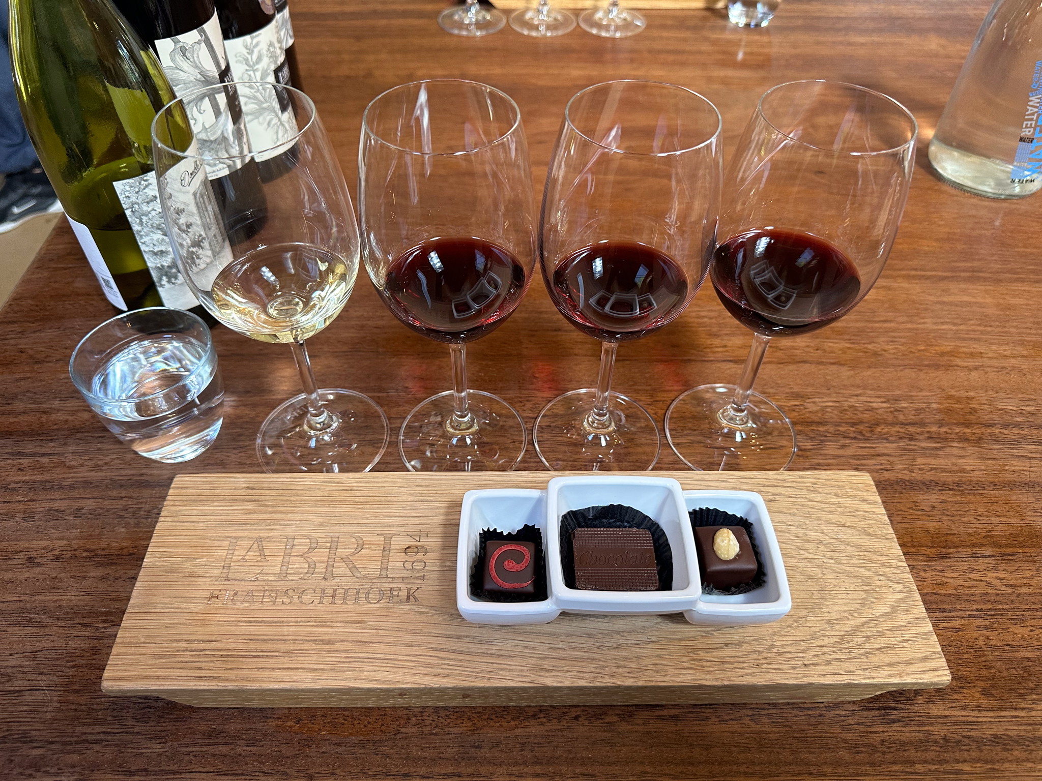As you may know South Africa is known for its excellent wines so we took an all-day wine tasting tour from Cape Town to the Stellenbosch and Paarl wine regions. Here are a couple of pics from the tour. The first was taken at the Fairview Winery. The second was a wine-chocolate pairing at La Bri Winery. Mmmmm…