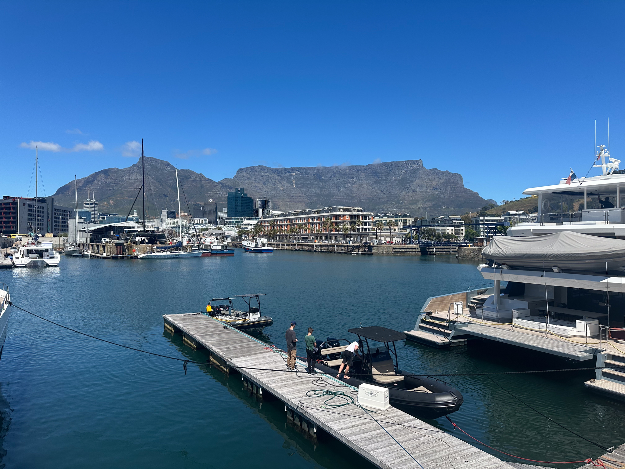 Karen and I decided to arrive in Cape Town three days before the start of the tour. This gave us time to overcome our jet lag and it provided an opportunity to explore the city. We often do this when going to new places and I would recommend it. Upon arrival we stayed in a hotel near the hopping wharf area of Cape Town. We had a comfortable walk down to the restaurants and shops right on the water. Here’s a picture of the wharf with Table Mountain the background taken from our restaurant during lunch.