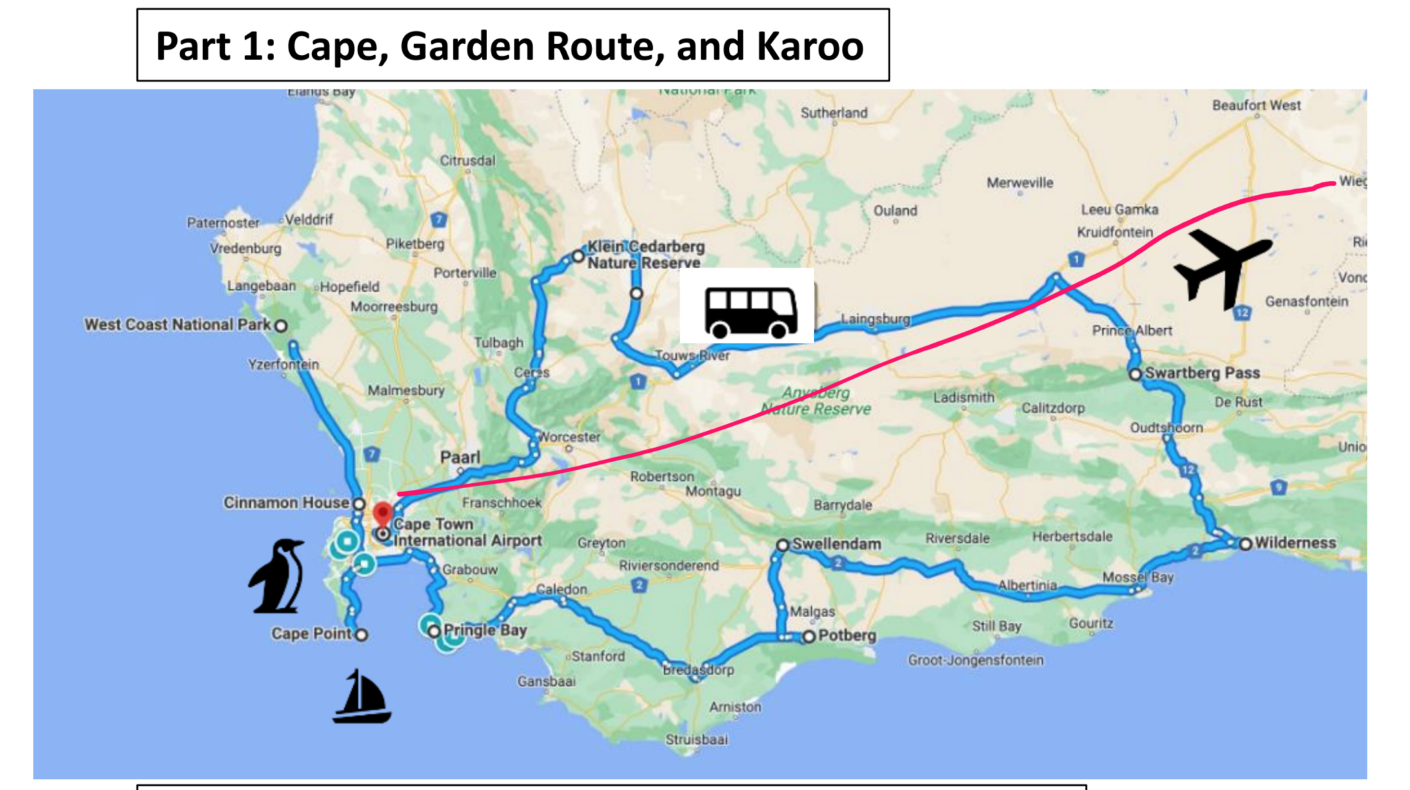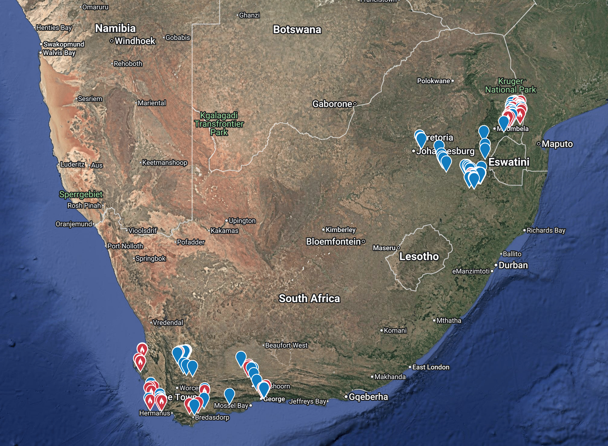 It was impossible to cover the country in only 17 days so the tour concentrated on two of the most productive areas. We flew into Cape Town (15 hour flight) and birded the southern part of the country first. On Day 10 we flew from Cape Town to Johannesburg and birded our way up to Kruger National Park. After four days in Kruger we flew back to Johannesburg and took our flights home.
