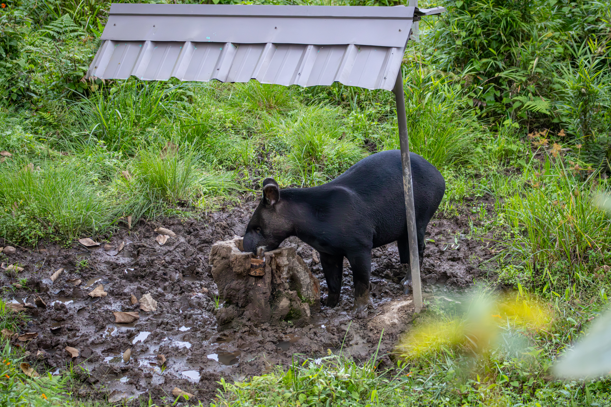 Remember that structure down below the observation deck? At dusk a Tapir came in to feed on some grain left out for it.
