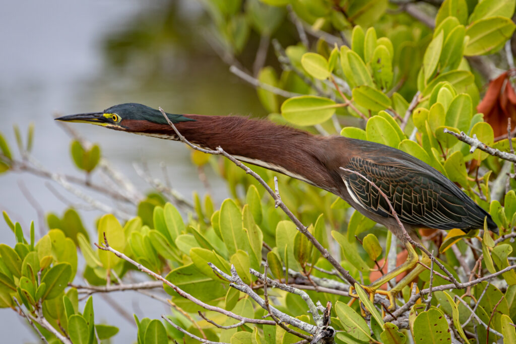 To be honest, we saw many more birds on the drive five years ago than we did this time – the water level was much higher due to Tropical Storm Eta a week ago. This time we saw a limited number of birds but one of the best views was of a Green Heron pair. These two herons were chasing each other in the foliage along the side of the road, then perching before resuming their game. Interestingly enough, Green Heron are one of a few species that use tools to hunt – they drop a twig or leaf into the water to attract fish then extend their neck to grab their prey (source: allaboutbirds.org).